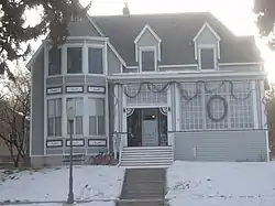 The A.V. Quinn House, also known as Pine Gables, was built in Evanston, Wyoming in 1883. The Victorian style house is a largely unaltered representative of the Queen Anne style in Evanston. The house was built for Anthony V. Quinn, a local banker who arrived in Evanston in the 1870s. Quinn became a prosperous landowner and a politician in the Wyoming Territory. His wife, Mattie, was involved in the Women's Temperance Movement, and is reputed to haunt the house. The house features a prominent two-story oriel window. The front porch was enclosed in the 1930s.[2]