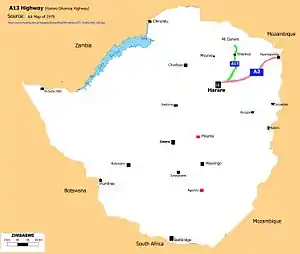 A13 Highway is a busy road in Zimbabwe running from Enterprise Road, Harare to Shamva, Madziwa Mine and through to Gora Turn-off on the A11 Highway towards Wimbo Shrine, Mt Darwin.[1]