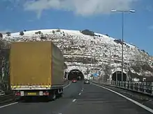 North of Folkestone the M20 becomes a dual carriageway and enters the Roundhill Tunnel before crossing over and dropping down into Dover. This part of the A20 was completed in 1993 as a project included in the Parliamentary Bill for the Channel Tunnel.[6] During 2011, structural failures in and around the Roundhill Tunnel have caused the A20 to be closed in this area numerous times.[7]