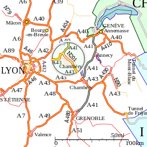 - the A41 South: 41 km long; mainly 2x2 lanes, 2x3 lanes near Grenoble;