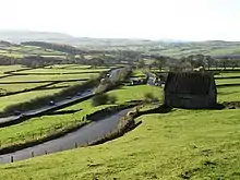 In Yorkshire at Beamsley Hill, there are two lanes east-bound (on an incline) and a single lane west-bound, some of which was improved at various points during the late 20th century, such as in Hazlewood, where the A59 was rerouted to become a largely straight road, bypassing the now older winding route which exists to its north-west.[16] The A59 was also rerouted just to the east of the Embsay and Bolton Abbey Steam Railway during the same period, requiring construction of a new Bolton Bridge over the River Wharfe, with the former alignment now forming a bridleway.[17]