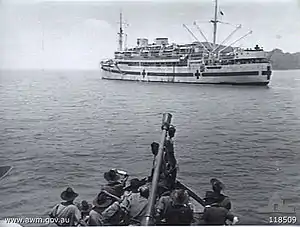 My first real sight of the hospital ship occurred at a range of well over a mile ... Distances and sizes of things at sea can be very deceptive ... [and] I realised she was far bigger in all respects than I had imagined. Wanganella, for such was her magic name, rode quietly at anchor unperturbed by wind or tide, unreal, dazzling white, clinically neat, a heavenly ship waiting patiently as a lover to receive us. ... I swayed with the motion of the MTB. My liberator Massey laughed at my weakness but enthused, 'This is one hell of a good ship. You'll be alright now cobber!' It seemed a contradiction in terms to call Wanganella 'a hell of a ship'; to me she appeared as a vessel from another world, but I understood his concern to reassure me that indeed there was now hope of a future for us all. The port side of the ship towered high above us. I viewed with dismay the formidable rank of steps leading from the launch to the main deck. ... The slow energy sapping climb began. Each patient, for that was what we had become; was escorted by male Australian nurses. They were taking good care, that even as we had been snatched from under the Japanese heel, we should not fall now, and be claimed by the sea. ... After an eternity of endeavour, advancing one step at a time, one by one we reached the deck. Behind me a voice avowed 'I would not like to have to do that all over again.' It was Slim Landers: I was not sure whether he meant the climb up the gangway or the three and a half years at Batu Lintang."