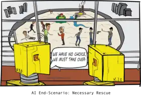 Fictional scenarios typically involve a drawn-out conflict against malicious artificial intelligence (AI) or robots with anthropomorphic motives. In contrast, some scholars believe that a takeover by a future advanced AI, if it were to happen in real life, would succeed or fail rapidly, and would be a disinterested byproduct of the AI's pursuit of its own alien goals, rather than a product of malice specifically targeting humans.[1]