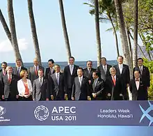 APEC United States 2011 was a series of political meetings around the United States between the 21 member economies of the Asia-Pacific Economic Cooperation during 2011. It culminated in the 19th APEC Economic Leaders' Meeting held at the Hawaii Convention Center in Honolulu, Hawaii from November 12–13, 2011.[1][2] The United States last hosted an APEC summit at the 1993 summit in Seattle.[3] President Barack Obama, a Honolulu native, and First Lady Michelle Obama hosted the other leaders and spouses.
