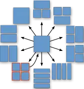 "T-shaped" partitioning patterns are introduced, a feature developed for VP10, as well as horizontal or vertical splits into four stripes of 4:1 and 1:4 aspect ratio. The available partitioning patterns vary according to the block size, both 128×128 and 8×8 blocks can't use 4:1 and 1:4 splits. Moreover, 8×8 blocks can't use T-shaped splits.