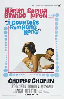A Countess from Hong Kong is a 1967 British romantic comedy film scored, written, and directed by Charlie Chaplin, and the final film directed, written, produced and scored by him. Based on the life of a former Russian aristocrat,[3] as he calls her in his 1922 book My Trip Abroad. She was a Russian singer and dancer who "was a stateless person marooned in France without a passport."[4] The film starred Marlon Brando and Sophia Loren, and revolved around an American diplomat who falls in love with a stowaway on a cruise. Sydney Chaplin (Chaplin's son), Tippi Hedren, Patrick Cargill and Margaret Rutherford co-star in major supporting roles; Chaplin also made a cameo, marking his final screen appearance.