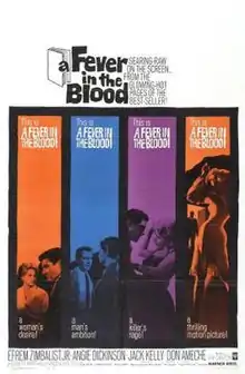 A Fever in the Blood is a 1961 American courtroom drama, produced and distributed by Warner Brothers.[1][2] The film features a roster of the studio's television contract players, often miscast according to the film's producer and screenwriter Roy Huggins in his Archive of American Television interview. In fact, Huggins later complained that the film's star, Efrem Zimbalist, Jr. was "too young for the role [of the judge] and I said so".[3] The picture, based on the 1959 novel of the same name by a retired Colorado lawyer, William Pearson, also featured Angie Dickinson, Jack Kelly, Don Ameche, Ray Danton, Herbert Marshall, Rhodes Reason, Robert Colbert, Carroll O'Connor (in his film debut), Parley Baer, and Saundra Edwards. The film was directed by Vincent Sherman, with music by Ernest Gold, cinematography by J. Peverell Marley, and editing by William H. Ziegler.