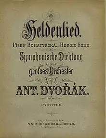 A Hero's Song was Dvořák's last orchestral work and the final of his five symphonic poems, the others being The Water Goblin, The Noon Witch, The Golden Spinning Wheel, and The Wild Dove (Opp. 107–110).[3] It is also the last instance of him writing purely instrumental music, as he dedicated himself to vocal and operatic works after its completion.[2] He began working on the piece on August 4, 1897, immediately after revising the third act of his opera The Jacobin.[2] The work was completed in three months, during which time Dvořák lived at his summer residence in his hometown of Příbram, and spent time at his chateau of the patron Josef Hlávka in Lužany.[2] The piece was completed on October 25 of the same year, and was published in 1899 by Fritz Simrock in Berlin.[4] The symphonic poem coincidentally anticipated Richard Strauss's similar tone poem Ein Heldenleben (A Hero's Life), which was composed a year later.[5] In fact, Dvořák originally intended to title the piece A Hero's Life, a name which had been suggested to him by his pupil Vítězslav Novák.[6]