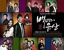 A Hundred Year Legacy (Korean: 백년의 유산; RR: Baengnyeon-ui Yusan) is a 2013 South Korean television series starring Eugene and Lee Jung-jin.[1][2] Revolving around themes of food, love and family, the warm human drama is about a modest Seoul noodle house that's been operated by the same family for three generations.[3][4] It aired on MBC from January 5 to June 23, 2013 on Saturdays and Sundays at 21:50 for 50 episodes.[5]