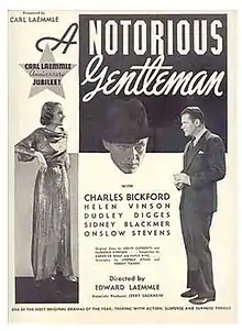 A Notorious Gentleman is a 1935 American drama film directed by Edward Laemmle and written by Leopold Atlas, Rufus King and Robert Tasker. The film stars Charles Bickford, Helen Vinson, Onslow Stevens, Dudley Digges, Sidney Blackmer and John Darrow. The film was released on January 21, 1935, by Universal Pictures.[1][2][3] The film was remade in 1946 as Smooth as Silk.
