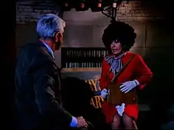 When Sally sees that the meeting is really with Frank and not Dr. Zubatski, she tries to leave, but Frank tells her what he has discovered. Before Sally was Sally, she was Babs Caltrane, a notorious gun runner in Memphis. But Frank notes that "Babs has red hair!" He grabs Sally's blonde hair, revealing it to be a wig with red hair underneath, showing that Sally is indeed Babs Caltrane. The joke continues as Frank then says before that she was a brunette hitman named ZaSu Pitts, and pulls off yet another wig. He then reveals that before that she sang back up for Aretha Franklin, and removes the brunette wig to reveal a large afro hairstyle. Sally then pulls this wig off, showing a military style buzz cut and claiming before that to have been in the U.S. Marines. Sally throws the red wig into Frank's face, momentarily incapacitating him (a joke that was re-used in The Naked Gun with a pillow instead of a wig). Sally runs away and hides behind some trash cans, and Frank takes cover behind a bench. Frank and Sally start shooting at each other, but we later see that they are really close to each other, a joke that was re-used in The Naked Gun 2½: The Smell of Fear. Eventually they run out of ammunition and start throwing guns at each other. Sally runs out of things to throw and attempts to flee. Just when Sally tries to run away, Ed, Sergeant Take-Her-Away and Sergeant Booker arrive to take her away and book her.
