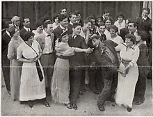 A Tango Tragedy is among several Lubin split-reel comedies made in the spring of 1914 that include the earliest screen appearances of Oliver Hardy. In most of these films he was an uncredited extra playing one of a group of cops or cowboys, or, as here, a man at the dance.[2] Although the film itself does not survive, Hardy can be seen looking over James Hodges's shoulder in a promotional still printed in The Lubin Bulletin, the studio's advertising newsletter.[1]