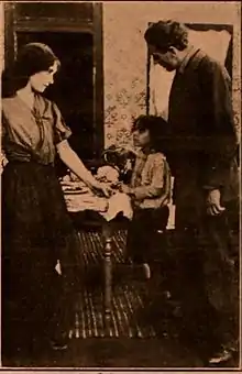 The writer of the scenario is unknown, but it was most likely Lloyd Lonergan. He was an experienced newspaperman employed by The New York Evening World while writing scripts for the Thanhouser productions.[5] The film director is unknown, but it may have been Barry O'Neil or Lucius J. Henderson. Cameramen employed by the company during this era included Blair Smith, Carl Louis Gregory, and Alfred H. Moses, Jr. though none are specifically credited.[6] The role of the cameraman was uncredited in 1910 productions.[7] Marie Eline was cast in the film, likely as the newspaper boy.[1] Eline had previously played a newspaper boy in Not Guilty.[8] The role of the flower girl has been claimed to be Frances Gibson by an answer column in Motion Picture Story Magazine. This is disputable because Gibson is known only to have a single credit with the Thanhouser Company, in the 1912 release of Nicholas Nickleby.[3] Around this time Gibson was appearing in Solax Studios productions.[3] Both immediate before and after her only Thanhouser credit, Gibson was employed by Solax, leading Bowers to speculate that her appearance in that one film may have been as a special project.[3] A different film still shows William Russell and opens the possibility of identifying the other actors.[4] The other cast credits are unknown, but many 1910 Thanhouser productions are fragmentary.[6] In late 1910, the Thanhouser company released a list of the important personalities in their films. The list includes G.W. Abbe, Justus D. Barnes, Frank H. Crane, Irene Crane, Marie Eline, Violet Heming, Martin J. Faust, Thomas Fortune, George Middleton, Grace Moore, John W. Noble, Anna Rosemond, Mrs. George Walters.[9]
