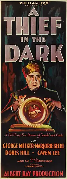 A Thief in the Dark is a 1928 American silent mystery film directed by Albert Ray, written by C. Graham Baker and William Kernell (based on a plot idea from director Ray), and starring George Meeker, Doris Hill, Gwen Lee, Marjorie Beebe, Michael Vavitch and Noah Young. The film was released on May 20, 1928, by Fox Film Corporation.[1][2][3]