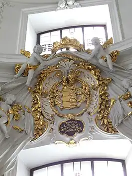 On the arch above the entrance, next to the coat of arms of Maria Theresa, on the right is that of Francis II, Holy Roman Emperor and on the left that of Joseph II, Holy Roman Emperor. In the niches of the chapel are statues of the four Hungarian saints. Stephen I of Hungary is leaning on a cross with his right hand, wearing the Hungarian crown on his head, his body covered with armour and a cloak. Ladislaus I of Hungary is also wearing a crown, holding a rudder staff in his right hand and leaning on an oval shield with his left. Saint Emeric of Hungary is also holding a baton and a lily in his hand, with his left hand on his heart. The fourth statue is of Adalbert of Prague, in episcopal regalia, leaning on his shepherd's crook with his left hand and holding a book in his right. On the inner wall on the right, a black marble plaque lists in Latin the holy kings and princesses of Hungary.