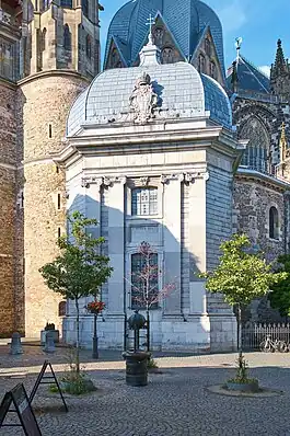 The Gothic chapel built on the south side of the cathedral was directly connected to the Carolingian octagon, the octagonal church of Charlemagne. The chapel had altars with the relics of Stephen I of Hungary, Saint Emeric of Hungary and Ladislaus I of Hungary, which must have been built by 1366, because Pope Urban V had already granted privileges to the chaplain of the chapel dedicated to Ladislaus I of Hungary in a bull of his.[11] In 1374, it is assumed that Louis I of Hungary himself visited Aachen to see the chapel, where the relics of the Hungarian saints gave the shrine a slightly Hungarian touch. This also contributed to the fact that the building was soon referred to as the Chapel of Hungary by the locals.[12]