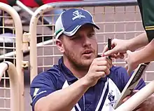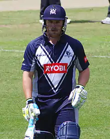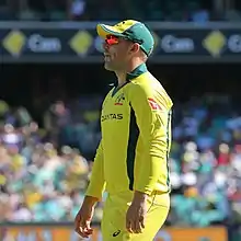 Aaron James Finch (born 17 November 1986) is an Australian cricket commentator and former international cricketer who served as the captain of the Australian cricket team in ODI and T20I cricket.[2] In domestic cricket, he currently plays for and captains the San Francisco Unicorns of Major League Cricket[3] Finch currently holds the record for two of the three highest individual scores in Twenty20 Internationals (T20I), his score of 172 against Zimbabwe in July 2018 beating his previous record of 156 against England in 2013.[4][5] Finch was a part of the Australian team that won the 2015 Cricket World Cup, and six years later as Australia's captain, Finch also led Australia to win the 2021 ICC Men's T20 World Cup, which was the maiden T20 World Cup title for the country. In July 2018, he became the first player to reach 900 rating points on the official International Cricket Council (ICC) T20I rankings.[6] He made his Test debut for Australia in October 2018. He is also a part time commentator with Fox Cricket and Triple M. Finch has played domestically for Victoria and Melbourne Renegades. He is an opening batter, and occasional left arm orthodox spinner.
