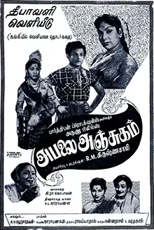 - 1 2 "1959 – அபலை அஞ்சுகம் – அருணா பிலிம்ஸ்" [1959 – Abalai Anjugam – Aruna Films]. Lakshman Sruthi (in Tamil). Archived from the original on 15 May 2017. Retrieved 15 May 2017.