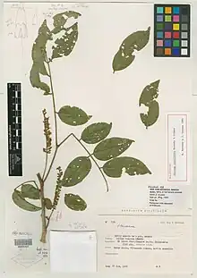 The trees reach up to 8 meters in height, with furrowed branchlets. The foliage is bright green in color. The dense racemes have small greenish or whitish flowers. Which are paired to a branch bud. The peduncles are between 1.5 to 4 centimeters in length. There are no pods on the plant.[3]