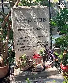 From 1946 to his death, Kovner was a resident of Kibbutz Ein HaHoresh.[28][29] He was active in Mapam as well as in HaShomer HaTzair, but never took on a formal political role.[30] He played a major part in the design and construction of several Holocaust museums, including the Diaspora Museum in Tel Aviv.[31] He died in 1987 (aged 69) of laryngeal cancer, perhaps due to his lifelong heavy smoking,[32] at his home in Ein HaHoresh. He was survived by his wife Vitka Kempner, who married Kovner in 1946, and their two children.[29]