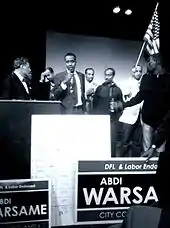 Abdi Warsame (Somali: Cabdi Warsame, Arabic: عبدي وارسام) (born 1978) is a Somali-American politician in Minnesota's Democratic–Farmer–Labor Party. After moving to London as an asylum-seeker, he immigrated to Minnesota in 2006. In November 2013, he was elected to the Minneapolis City Council, becoming the first Somali official to be elected to the position.[1] Warsame was reelected for a second term in 2017. He resigned from the position in 2020 to become the head of the Minneapolis Public Housing Authority.