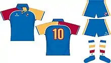 The strip uses the four colours of the university crest - royal blue, gold, red and white. The design was based on the quarters of the university crest and the previous rugby 1st XV strips. The traditional colours of royal blue and gold had to be supplemented due to Heriot-Watt University carrying out a similar project several years previously and their colours also being royal blue and gold. The away strip was opposite with red as the main.