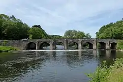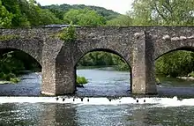 The bridge has seven voussoired arches and cutwaters below.[7] The parapets were rebuilt in the 20th century,[1] and have flat coping stones.[3] It is a Grade II* listed building[7] and a Scheduled Monument.[3]