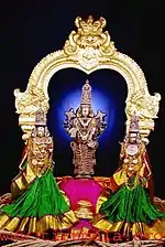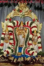 The festival lasts three days[1] and on each of these days, after the second bell, the lord and his consorts are taken to the Kalyanotsava mantapa (Hall used for celestial wedding) and Snapana Tirumanjanam is conducted amidst vedic chants. Snapana Tirumanjanam involves performing a bath to the deities involving holy and consecrated water mixed with spices including turmeric. The lord and his consorts are attired in different kavacham (armours) on each of these days.[2]