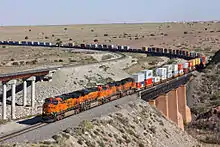 Now part of the BNSF system and known as the Clovis subdivision of the Southern Transcon, the rail corridor is one of the most heavily trafficked routes in the western US. An average of almost 90 trains daily passed through Abo Canyon in 2006, each typically 6000 to 8000 feet in length.[2]
