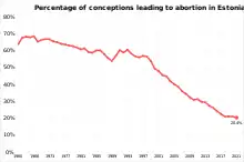 In 2010, there were 9087 abortions in Estonia, which meant 57.4 abortions for every hundred live births.[5] As of 2010, the abortion rate was 25.5 abortions per 1000 women aged 15–44 years.[6]