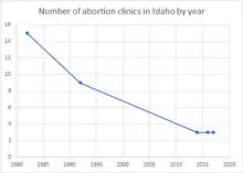 Between 1982 and 1992, the number of abortion clinics in the state decreased by six, going from fifteen in 1982 to nine in 1992.[16] In 2014, there were three abortion clinics in the state.[17] In 2014, 95% of the counties in the state did not have an abortion clinic. That year, 68% of women in the state aged 15–44 lived in a county without an abortion clinic.[18] In 2017, there were three Planned Parenthood clinics, all of which offered abortion services, in a state with a population of 365,502 women aged 15–49.[19]