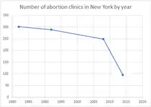 In the 1940s, police would raid suspected illegal abortion clinics.[36] Between 1982 and 1992, the number of abortion clinics in the state decreased by thirteen, going from 302 in 1982 to 289 in 1992.[37] The number of abortion providers in New York was 266 in 1996.[38] In the period between 1992 and 1996, the state ranked third in the loss of number of abortion clinics, losing 23 to have a total of 266 in 1996.[38] In 2008, the states with the most providers were California with 522 and New York with 249.[39] In 2014, there were 95 abortion clinics in New York,[40] and 44% of the counties in the state did not have an abortion clinic. That year, 10% of women in the state aged 15–44 lived in a county without an abortion clinic.[41] In 2017, there were 58 Planned Parenthood clinics, of which 49 offered abortion services, in a state with a population of 4,718,933 women aged 15–49.[42]