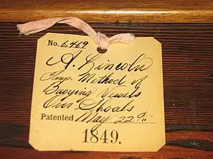 Lincoln labeled his invention Buoying Vessels Over Shoals and it was used to get them over shoals.[7] He envisioned a system of waterproof fabric bladders that could be inflated when necessary to help ease a stuck steamboat over such obstacles.[8] When crew members knew their ship was stuck, or at risk of hitting a shallow, Lincoln's invention could be activated, which would inflate accordion-shaped air chambers along the sides of the watercraft to lift it above the water's surface, providing enough clearance to avoid a disaster.[9] As part of the research process, Lincoln designed a scale model of a ship outfitted with the device.[10] This model (built and assembled with the assistance of a mechanic from Springfield named Walter Davis[10]) that was originally taken to the United States Patent and Trademark Office in Washington[11] is now on display at the Smithsonian Institution.[12] At the time the patent was issued, Lincoln was a congressman. He is the only United States president to be a patentee.[12]