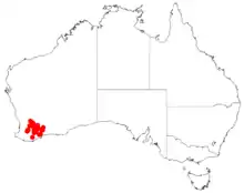 It is native to an area in the Wheatbelt and Great Southern regions of Western Australia where it is commonly situated on sandplains growing in gravelly and sandy loam soils.[1] The range of the plant extends from around Tammin in the north west to around Jerramungup in the south east.[2]