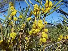Acacia cana is one of Australia's native wattles. It grows to about 6 metres in height and is a dense shrub-tree that is often described as gnarled and deformed in shape.[1][4] It is a native species that is a perennial that produces 15–35 flowers that are coloured bright yellow to golden, these flowers start to occur in August right through to October.[6][7] The shrub is found to have 5–13 cm long branchlets (phyllodes) that are covered in fine silver hairs; leaves are thin with a length of 6 cm and a width of 5mm. While pods are slightly curved but thin with a length of around 10 cm and are covered in fine hairs.[8] Some distinctive traits of Acacia cana is that it has one gland located at the base of the plant, that most of this species is covered in fine small hairs and it bark is grey.