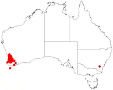 It is native to an area along in the South West and the Wheatbelt regions of Western Australia.[2] It is found growing in sandy to gravelly lateritic or granitic soils amongst woodland or kwongan[1] or on laterite hills as part of Eucalyptus (often Eucalyptus accedens) woodland communities.[3]