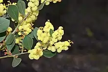 The bushy shrub or tree typically grows to a height of 1 to 3 metres (3 to 10 ft).[2] It has phyllodes that are 2 to 6 centimetres (0.8 to 2.4 in) in length and 5 to 25 mm (0.20 to 0.98 in) wide with prominent central and marginal nerves.[1] Each phyllode has an obovate to oblanceolate or elliptic shape.[3] It blooms from April to August and produces yellow flowers.[2] The inflorescences are composed of a raceme with 10 to 20 heads over a length of 3 to 12 centimetres (1.2 to 4.7 in) with globular heads containing two to three bright golden flowers. Erect, linear, woody and straight to shallowly curved seed pods form after flowering and are to around 12 cm (4.7 in) long and 3 to 4 millimetres (0.118 to 0.157 in) wide. The oblong glossy brown seeds within are 4 to 5 millimetres (0.157 to 0.197 in) in length.[3]