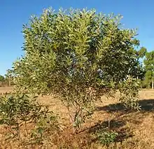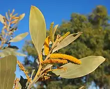The shrub typically grows to a height of 2 to 4 m (6 ft 7 in to 13 ft 1 in) or is found sometimes as a tree up heights of around 9 m (30 ft) usually with a spreading habit. It has sericeous new shoots with pale yellow-brown hairs that age to have a silvery colour. The acutely angled branchlets are silvery-sericeous. The silvery-green to grey-green phyllodes usually have an obliquely narrowly elliptic shape that is more or less straight but often shallowly recurved at the apice. The phyllodes are around 11 to 20 cm (4.3 to 7.9 in) in length and have a width of 1 to 5.5 cm (0.39 to 2.17 in) and have a knob shaped mucro. The rudimentary inflorescences occur in pairs in the racemes and have a axes length of 0.5 mm (0.020 in). The golden flower spikes are 3.5 to 6 cm (1.4 to 2.4 in) in length with hairy petals. The seed pods that form later are openly and strongly curved or tightly and irregularly coiled or twisted with twisted dehisced valves. The glabrous pods have a width of 3.5 to 4 mm (0.14 to 0.16 in) and are thinly coriaceous to crustaceous. The glossy brown to black coloured seeds within the pods have an oblong shape and are 4 to 4.5 mm (0.16 to 0.18 in) in length with a bright yellow aril.[6]