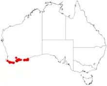 It is native to an area along the south coast in the Goldfields-Esperance, Great Southern and South West regions of Western Australia where it commonly occurs among granite outcrops and hills and on sandplains where it grows in sandy or rocky soils usually over granite or quartzite.[1] The bulk of the population is found between Albany and Cape Arid National Park with other scattered outlying populations. It is often part of mallee scrub and heath communities.[2]