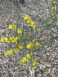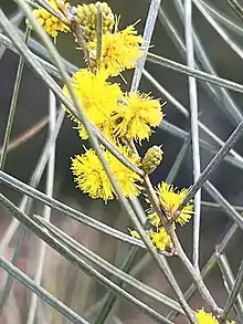 The shrub typically grows to a maximum height of around 3 m (9.8 ft) and has multiple stems. It has grey to maroon coloured minni ritchi style bark. The sub-glabrous or silky haired branchlets are angular towards the apices and a maroon-grey colour with young shoots that have fine yellow hairs close to the stem. Like most species of Acacia it has phyllodes rather than true leaves. The erect, thick, evergreen phyllodes have a linear shape with a length of 8.5 to 18 cm (3.3 to 7.1 in) and a width of 0.7 to 1.5 mm (0.028 to 0.059 in) with longitudinal striations and around 25 closely parallel veins.[3] It blooms between August and September producing golden flowers. The obloid flower-spikes are around 0.4 to 1.2 cm (0.16 to 0.47 in) in length packed with golden coloured flowers. After flowering firmly chartaceous seed pods form that are flat and have a linear shape with reasonably straight sides but slightly constricted between seeds. The pods are 4 to 7 cm (1.6 to 2.8 in) in length and 2 to 3 mm (0.079 to 0.118 in) wide and have loosely matted hairs. The dark brown seeds inside are arranged longitudinallyand have a narrow oblong-elliptic shape with a length of approximately 3 mm (0.12 in) and a depressed grey-brown areole.[3]
