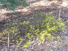 The shrub has a dense spreading habit and typically grows to a height of less than 1.5 m (4 ft 11 in). It has ribbed, red to brown coloured branchlets that are asperulate. The pungent, rigid, glabrous, green phyllodes are subsessile and patent to inclined. The phyllodes are straight to shallowly recurved and have a length of 1.5 to 4.5 cm (0.59 to 1.77 in) and a width of 1 to 1.3 mm (0.039 to 0.051 in) and have 10 to 12 distant raised nerves.[3] It blooms between May and October[4] and produces simple inflorescences simple in groups of one to four situated in the axils. The spherical flower-heads have a diameter of 3.5 to 4.5 mm (0.14 to 0.18 in) and contain over 20 bright yellow flowers. The brown undulate seed pods that form after flowering have yellow margins. The coriaceous seed pods have a length of around 2 cm (0.79 in) and a width of 2 mm (0.079 in). The dull dark brown to black coloured seeds in the pods have an oblong to elliptic shape and are around 3 mm (0.12 in) in length.[3]