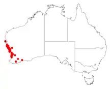It is native to an area in the Mid West, Wheatbelt and Great Southern regions of Western Australia between Northampton in the north to Lake Grace in the south where it is found on sandplains and coastal cliffs, laterite hills and granite outcrops where it grows in skeletal sandy soils.[1] It can be a part of heathland communities or in wandoo or marri woodland communities.[2]