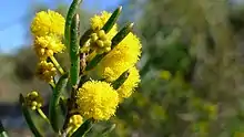 The spreading shrub typically grows to a height of 0.2 to 1.2 metres (1 to 4 ft).[1] The loosely villous branchlets have caducous, connate stipules that are around 2 mm (0.079 in) in length. The fleshy, green, linear to narrowly oblong shaped phyllodes are planoconvex to horizontally flattened with a length of 5 to 25 mm (0.20 to 0.98 in) and a width of 0.5 to 1.5 mm (0.020 to 0.059 in).[2] It blooms from April to August and produces yellow flowers.[1] The simple inflorescences are found singly or in pairs in the axils. The spherical flower-heads have a diameter of 3.5 to 4 mm (0.14 to 0.16 in) containing 18 to 33 golden flowers. The linear seed pods that form after flowering have a length of up to 2.5 cm (0.98 in) and a width of 1.5 mm (0.059 in) and contain oblong shaped seeds that are 2 to 2.5 mm (0.079 to 0.098 in).[2]