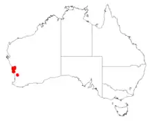 It is native to an area in the Wheatbelt region of Western Australia where it is typically found on sandplains growing in sandy soils.[1] It has a disjunct distribution with population found near Toodyay, Cervantes and Eneabba where it is usually a part of heathland or Corymbia calophylla forest communities.[2]