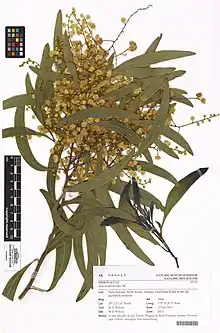 The shrub or tree typically grows to a height of 2 to 10 m (6 ft 7 in to 32 ft 10 in) and has an erect or spreading habit. It has finely to deeply fissured bark that is grey to black in colour. The glabrous branchlets are angled and commonly terete. It has mostly green phyllode with an oblanceolate or narrowly elliptic shape that are straight to falcate. The glabrous phyllodes have a length of 8 to 22 cm (3.1 to 8.7 in) and a width of 12 to 40 mm (0.47 to 1.57 in) with a prominent mid-vein.[1] It can bloom between July and October but most commonly between August and September and produces inflorescences that appear in groups of 5 to 18 in axillary racemes. The spherical flower-heads have a diameter of 5 to 6 mm (0.20 to 0.24 in) and contain 13 to 25 pale yellow to cream coloured flowers that are occasionally bright yellow. The flat, leathery, brown seed pods that form after flowering are more or less straight but can be slightly curved. The pods are 5 to 13 cm (2.0 to 5.1 in) in length and 12 to 25 mm (0.47 to 0.98 in) wide.[1] The shiny, black seeds within the pods have an oblong to elliptic and are 5.5 to 7 mm (0.22 to 0.28 in) in length.[2]