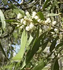 The tree can grow to a height of up 10 to 20 m (33 to 66 ft) and forms a dense canopy. It has flexuose and pendulous branchlets that are glabrous. The light green phyllodes have a narrowly oblong to narrowly elliptic shape. The phyllodes have a length of 4 to 15 cm (1.6 to 5.9 in) and a width of 7 to 20 mm (0.28 to 0.79 in) with prominent midribs and marginal nerves.[1] It mostly flowers in the summer months between November and March.[2] The inflorescences occur in groups of two to eight usually as axillary clusters with spherical flower-heads containing 20 to 40 cream coloured flowers. The thinly coriaceous seed pods that form after flowering have a length of up to 12.5 cm (4.9 in) and a width of 10 to 13 mm (0.39 to 0.51 in) and have a prominent nerve along the margin. The slightly shiny dark brown flat seeds within the pod have an oblong to orbicular shape with a length of 6 to 7 mm (0.24 to 0.28 in).[1]