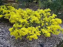 The shrub has an erect or sometimes straggling habit and can grow to a height of around 1.5 to 2.5 m (4 ft 11 in to 8 ft 2 in) and often spreads by suckering. It has smooth greenish brown to grey or light brown coloured bark and angled hairy branchlets. Like most species of Acacia it has phyllodes rather than true leaves. The crowded, glabrous and evergreen phyllodes are straight to slightly curved, with a length of 1 to 6.5 cm (0.39 to 2.56 in) and a width of 0.4 to 1 mm (0.016 to 0.039 in) and have an indistinct midvein. It blooms between July and October producing yellow flowers. The simple inflorescences are found in groups of 2 to 19 in an axillary raceme. The spherical flower-heads have a diameter of 3 to 5 mm (0.12 to 0.20 in) and contain four to eight yellow to dark yellow coloured flowers. Following flowering firmly papery to thinly leathery glabrous seed pods form. The straight or slightly curved pods are more or less flat and straight sided or constricted a little between each of the seeds. the pods are around 2.7 to 8.5 cm (1.1 to 3.3 in) in length and 4 to 7 mm (0.16 to 0.28 in) wide.[2]