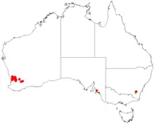 It is native to an area in the Wheatbelt region of Western Australia where it is commonly found growing in clay, sandy, loamy and sometimes rocky soils.[1] It is situated throughout the drainage basin of the Avon River from around Goomalling in the north to around Brookton in the south and is situated on plains, along watercourses and on roadsides commonly as a part of Eucalyptus wandoo communities.[2]