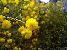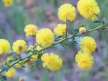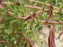 The shrub typically grows to a height of 1.5 m (4 ft 11 in) that branches freely and has flexuose and spine tipped pale green branchlets and 1 mm (0.039 in) stipules. The leaves are composed of three to five pinnae.[3] Prickly moses is one of only a small number of Acacia species to have true leaves, rather than phyllodes. It has feathery, bipinnate leaves with leaflets up to 5 mm long. At the base of each leaf is one or two spines. It flowers in late winter and early spring. The rudimentary inflorescences occur in groups of one to three racemose spherical flower-heads with a diameter of about 1 cm (0.39 in) usually containing 10 to 40 but sometimes up to 60 golden coloured flowers. The crustaceous seed pods that form after flowering have a narrowly oblong shape and are flat or slightly undulate with a length of 1.5 to 5 cm (0.59 to 1.97 in) and a width of 3 to 5 mm (0.12 to 0.20 in). The brown seeds inside have a mostly oblong shape and are 2.5 to 4.5 mm (0.098 to 0.177 in) in length.[4] The name "prickly moses" is said to be a corruption of "prickly mimosa".