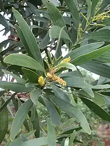 The tree typically grows to a maximum height of 12 m (39 ft) and has slender, glabrous branchlets.[1] Like most species of Acacia it has phyllodes rather than true leaves. The glabrous and dark green coloured phyllodes have a narrowly elliptic shaped and recurved to a sickle shape. They are 9 to 17 cm (3.5 to 6.7 in) in length and have a width of 6 to 16 mm (0.24 to 0.63 in) with two main longitudinal veins that have greater prominence than the others. When it blooms it produces simple inflorescences that occur in pairs in the axils. The cylindrical flower-spikes have a length of 3 to 8 cm (1.2 to 3.1 in) with creamy coloured flowers that occur in interrupted bands. Following flowering flat and spirally coiled seed pods form that have a width of 3.5 to 5 mm (0.14 to 0.20 in) are glabrous and covered in a fine white powder. The seeds inside the pods are arranged longitudinally or slightly obliquely. The shiny dark brown seeds have an oblong shape with a bright yellow aril that is folded many times under the seed.[1]
